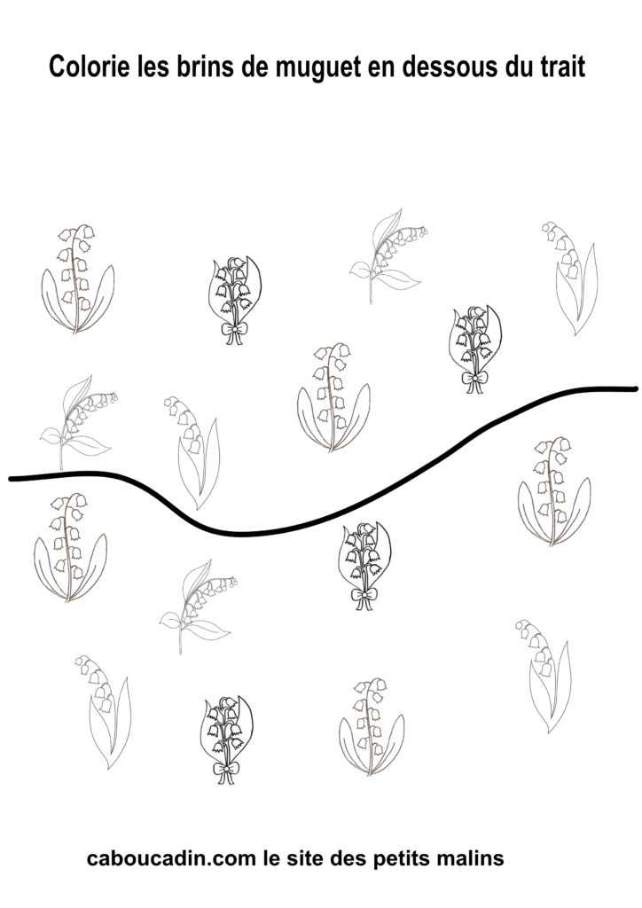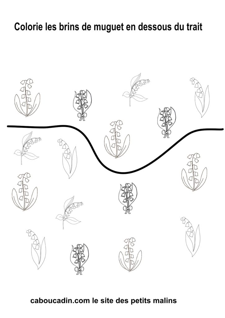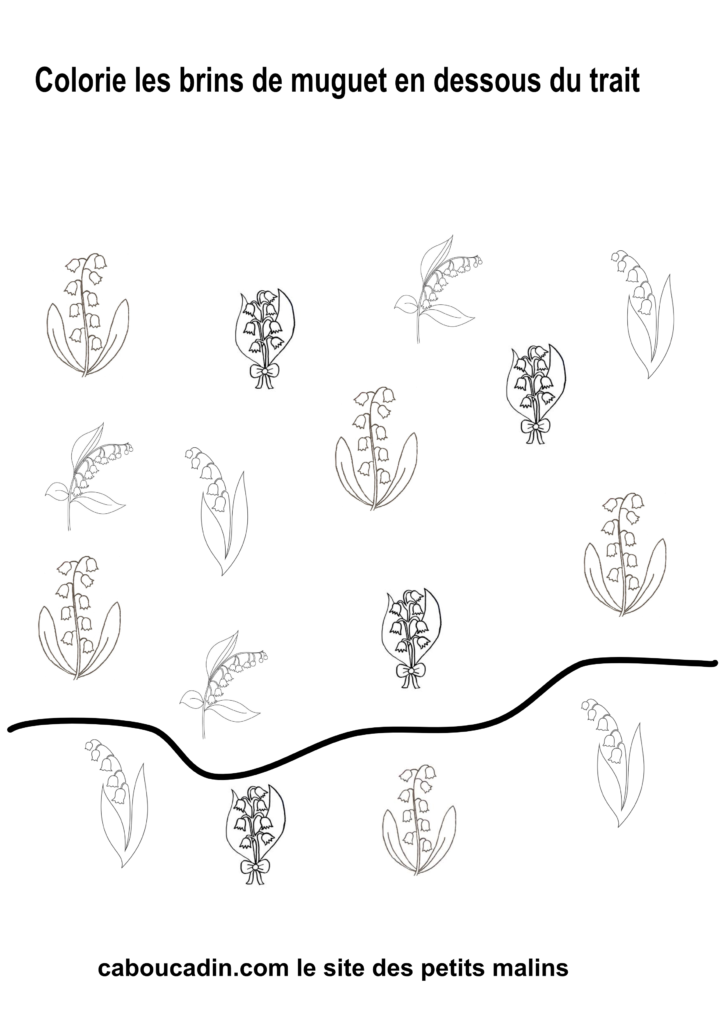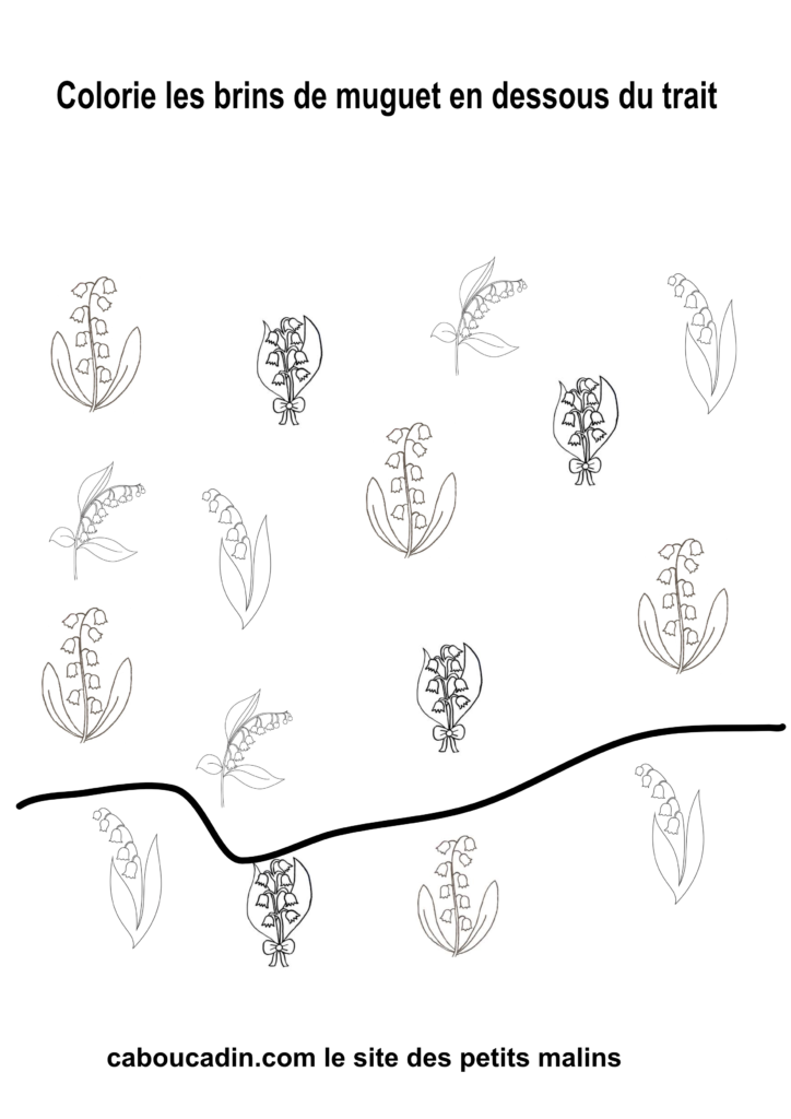 5 fiches maternelles 1er Mai : Apprendre en dessous. Apprendre la notion « en dessous » grâce à des fiches maternelles d’observations sur le thème du 1er Mai avec des coloriages de brins de muguet à colorier. Le but de l’exercice est simple , il suffit de colorier les brins de muguet qui se trouvent en dessous du trait.