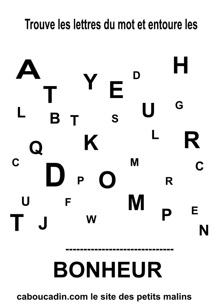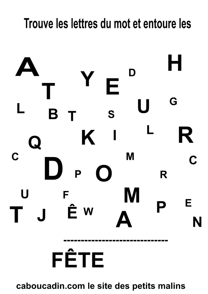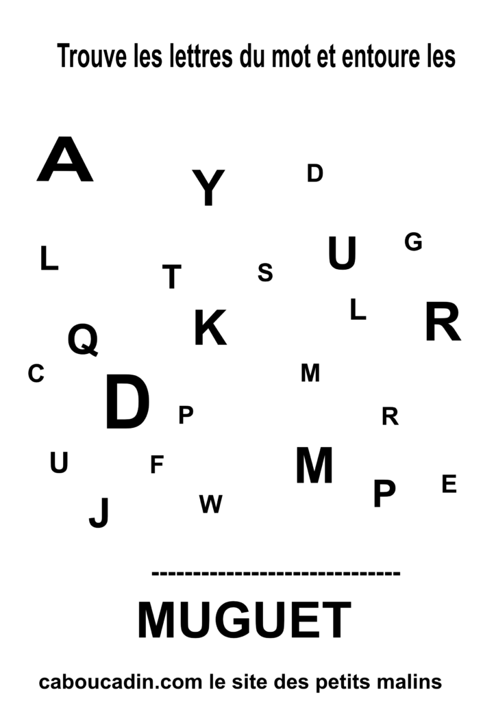 5 fiches maternelles 1er Mai : trouve les lettres et entoure les. Des fiches maternelles sur le thème du 1er mai où le but est de trouver les différentes lettres d’un mot sur le thème du 1er Mai. Par exemple, le mot « muguet » : le principe et de trouver et d’entourer toutes les lettres qui composent le mot muguet.
