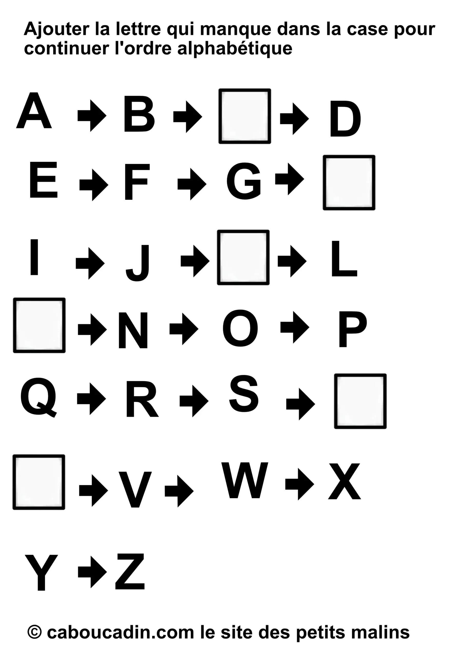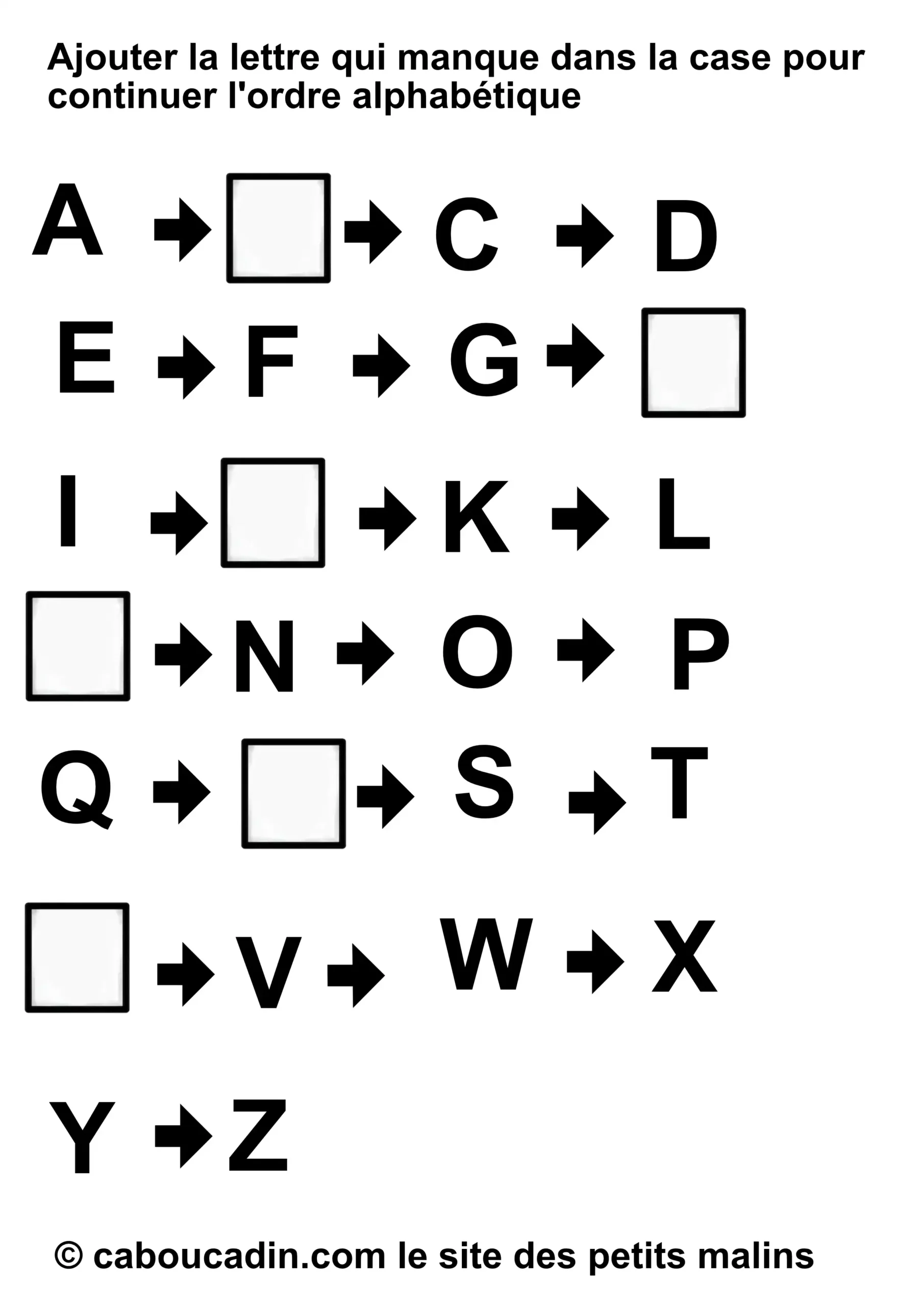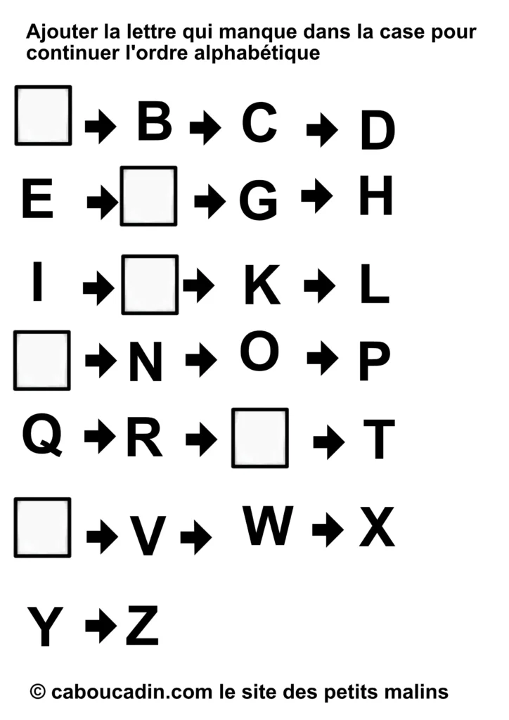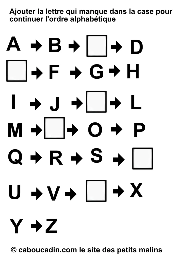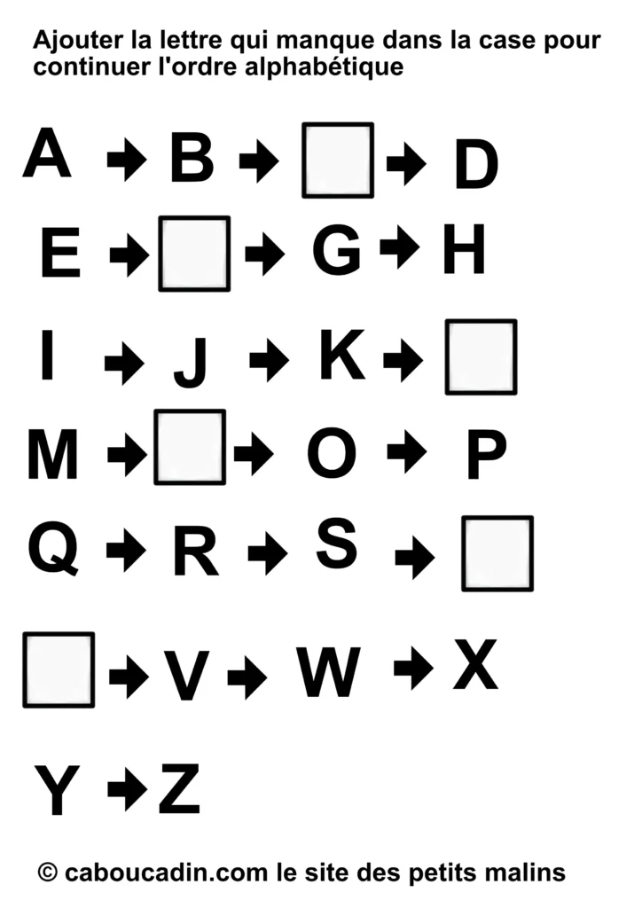 L’enfant doit regarder, réfléchir, et écrire la lettre manquante dans la case vide.