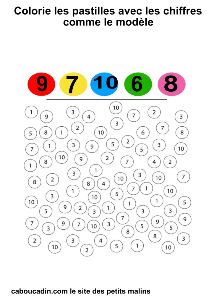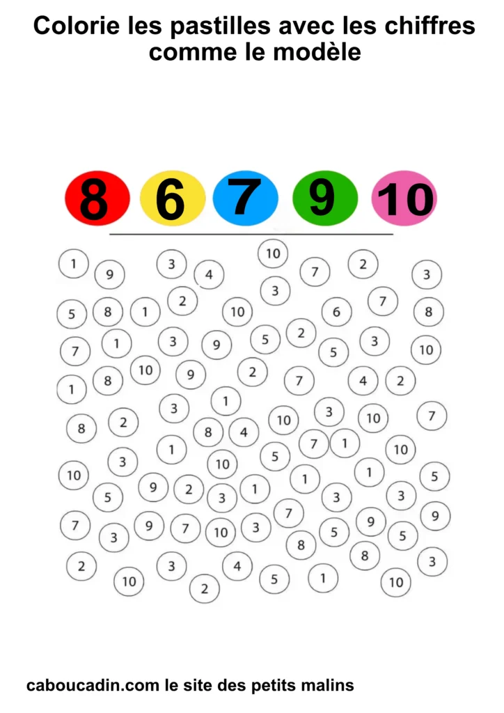 Fiche maternelle : Apprendre à compter jusqu’à 10. Trouve les chiffres du modèle et colorie la pastille de la couleur indiquée.