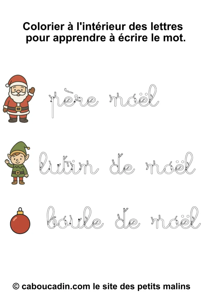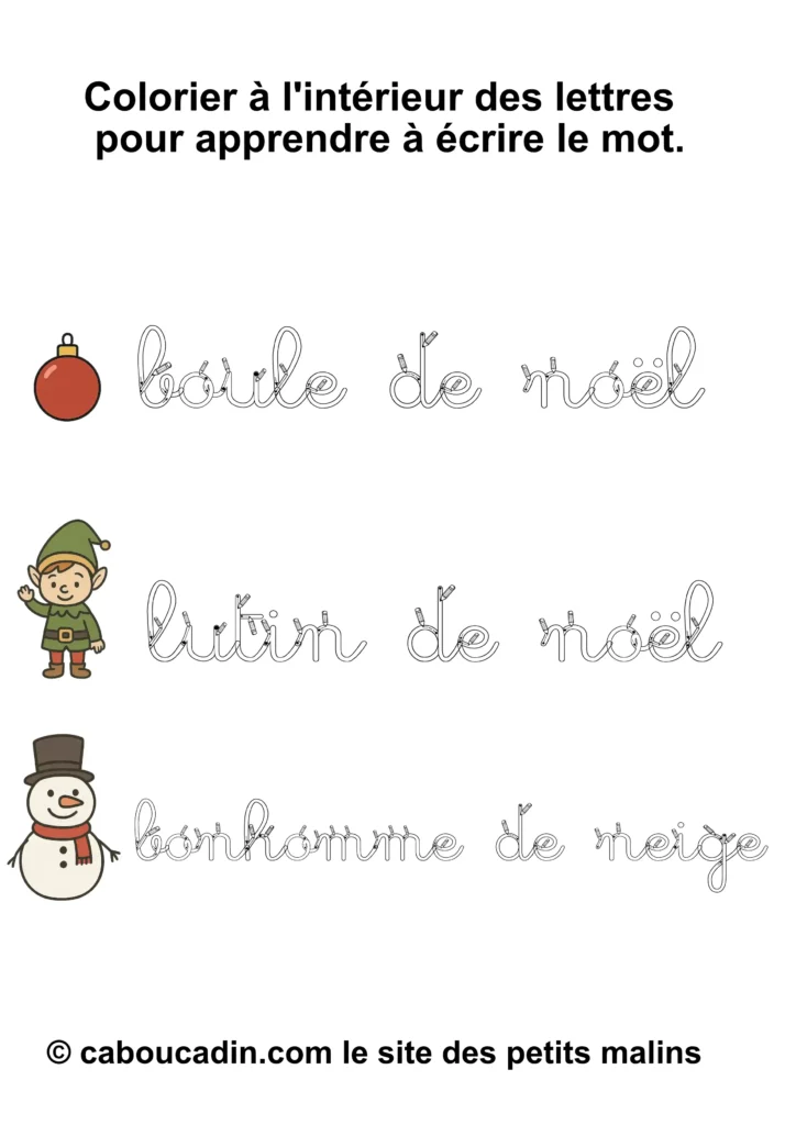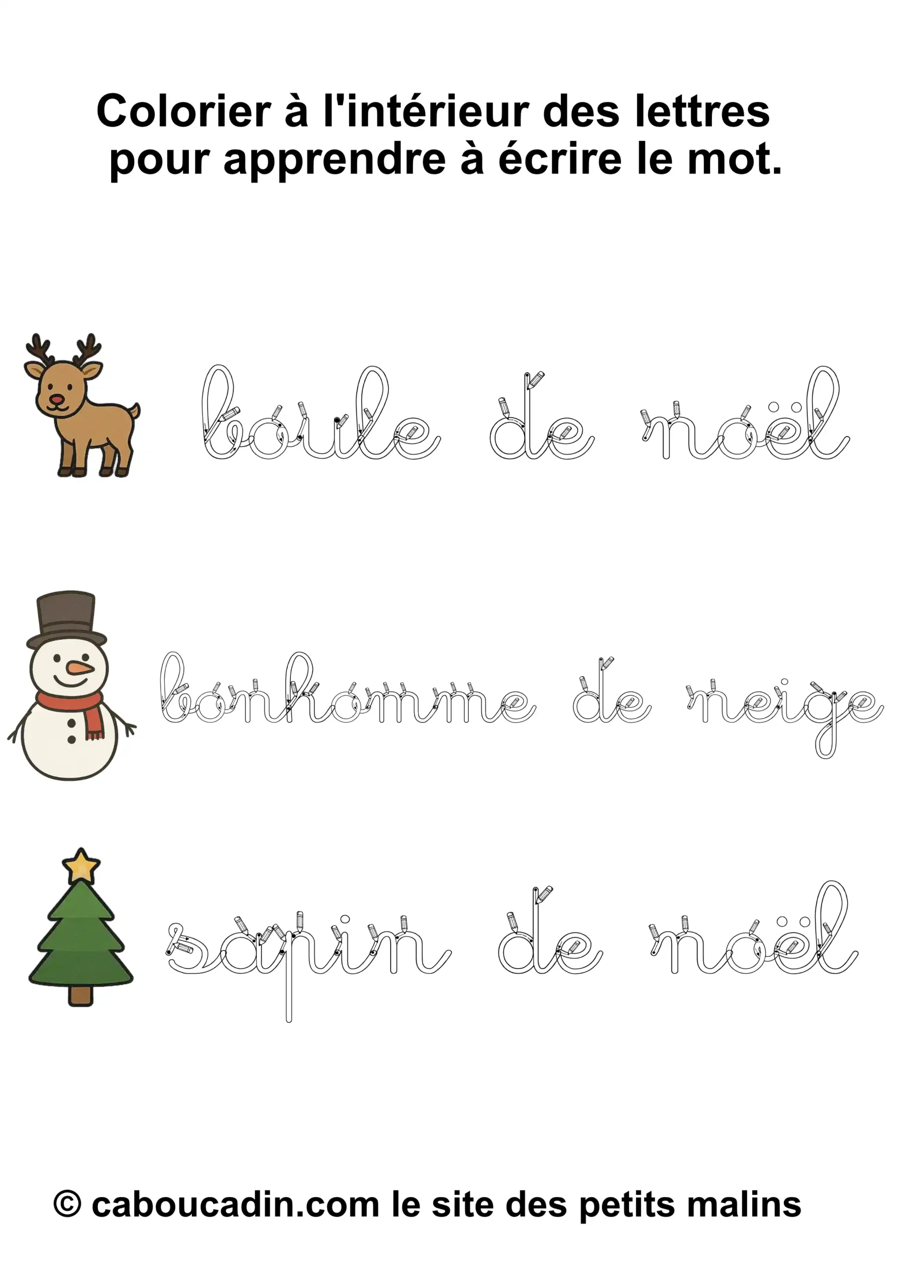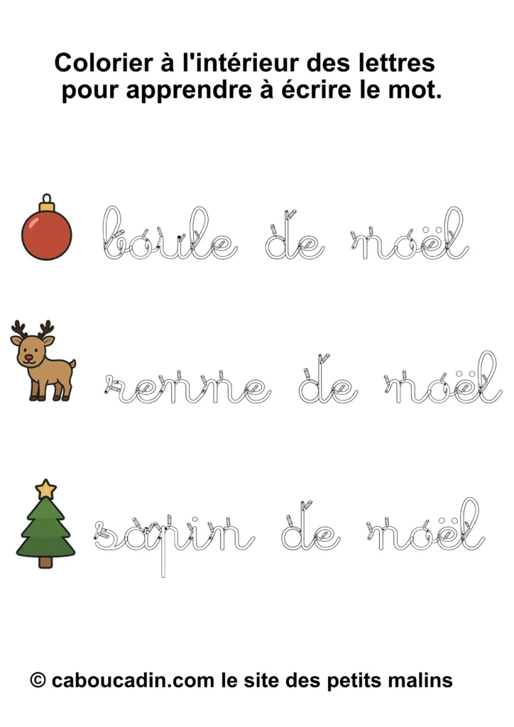 Sur cette fiche toute douce, tu vas rencontrer des mots qui sentent bon Noël : boule de Noël, renne de Noël, sapin de Noël. Des mots que tu connais peut-être déjà, ou un peu, ou pas du tout… c’est pas grave, t’inquiète pas. Ils sont écrits en grandes lettres creuses, un peu comme des petits chemins qui attendent que tu viennes mettre de la couleur dedans. 🌈