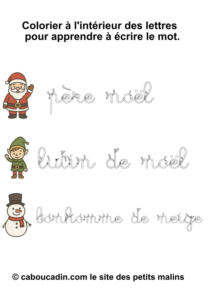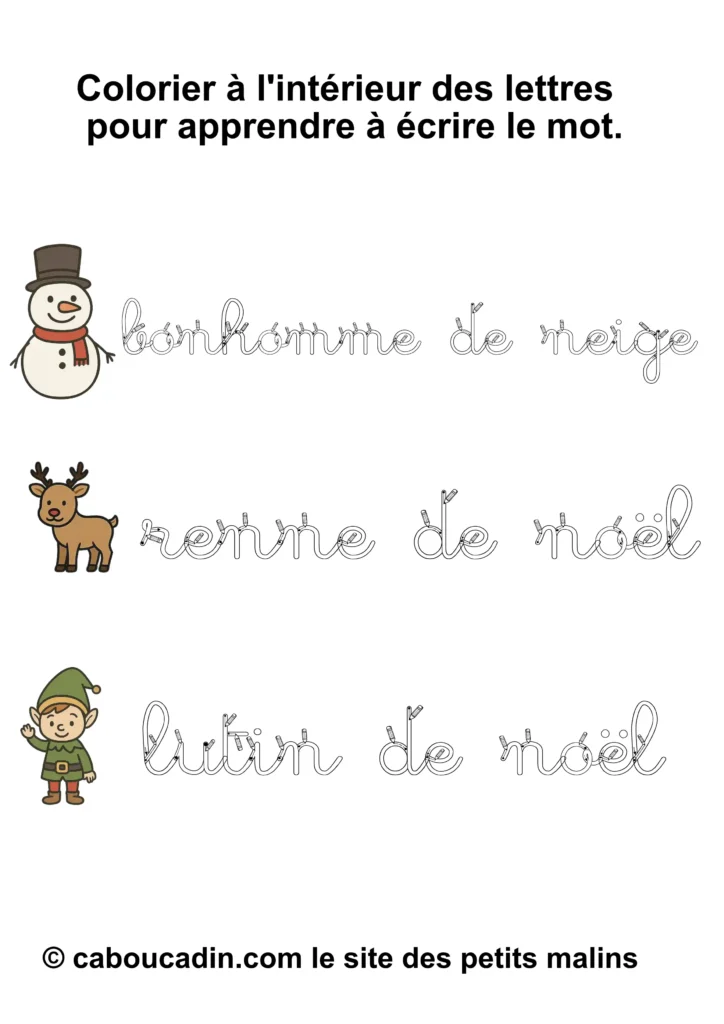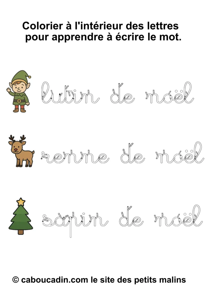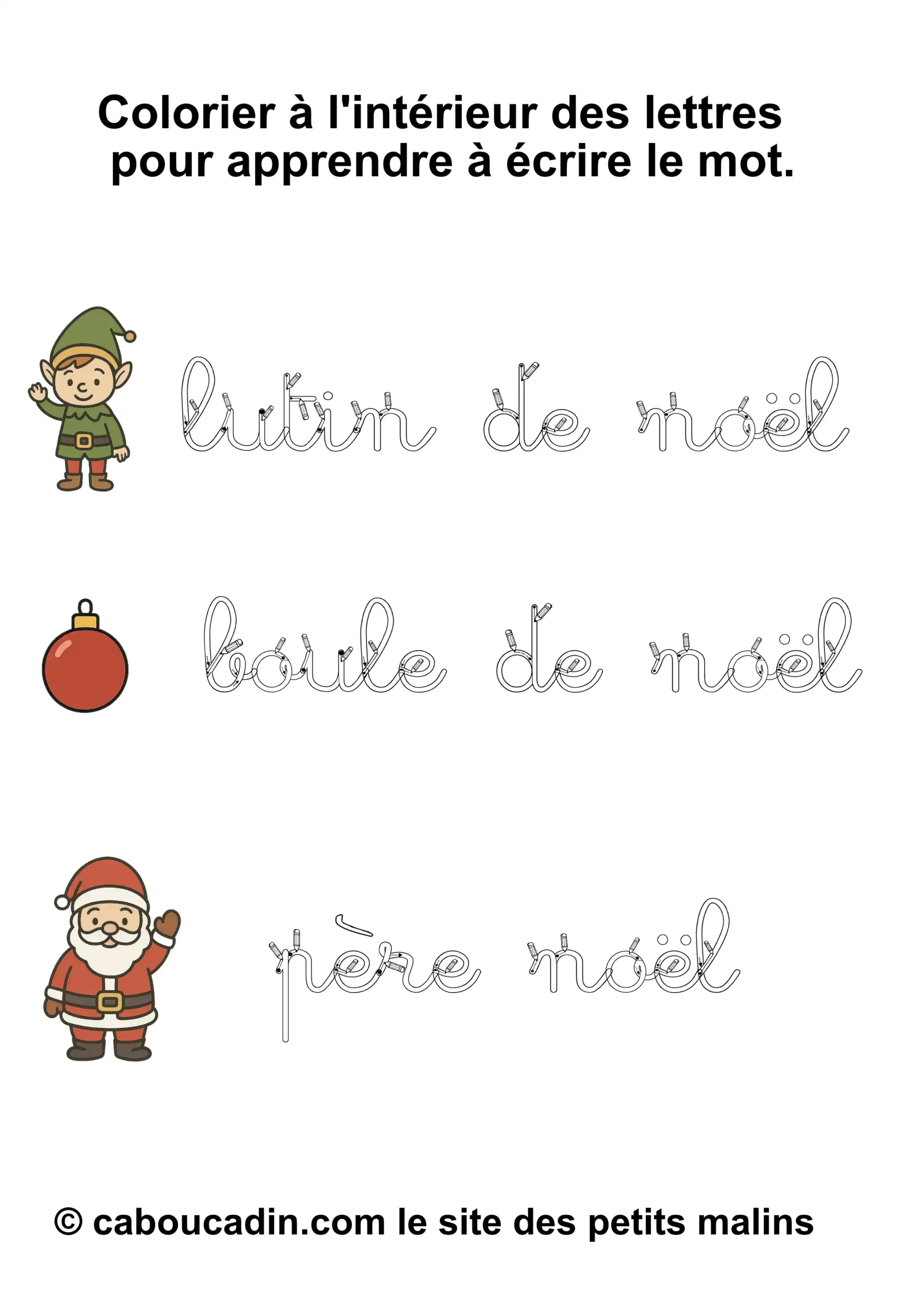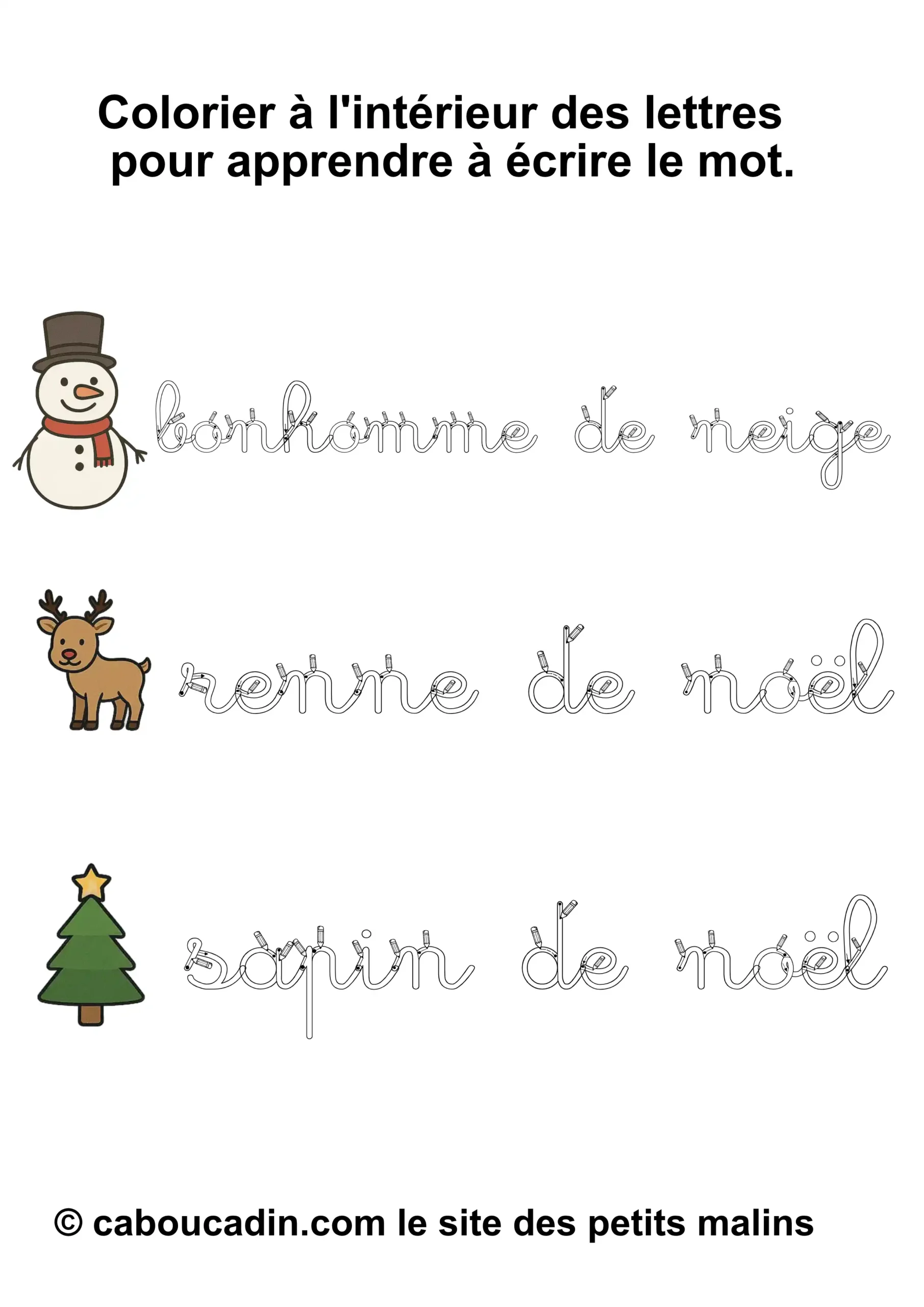 Sur cette fiche toute douce, tu vas rencontrer des mots qui sentent bon Noël : boule de Noël, renne de Noël, sapin de Noël. Des mots que tu connais peut-être déjà, ou un peu, ou pas du tout… c’est pas grave, t’inquiète pas. Ils sont écrits en grandes lettres creuses, un peu comme des petits chemins qui attendent que tu viennes mettre de la couleur dedans. 🌈