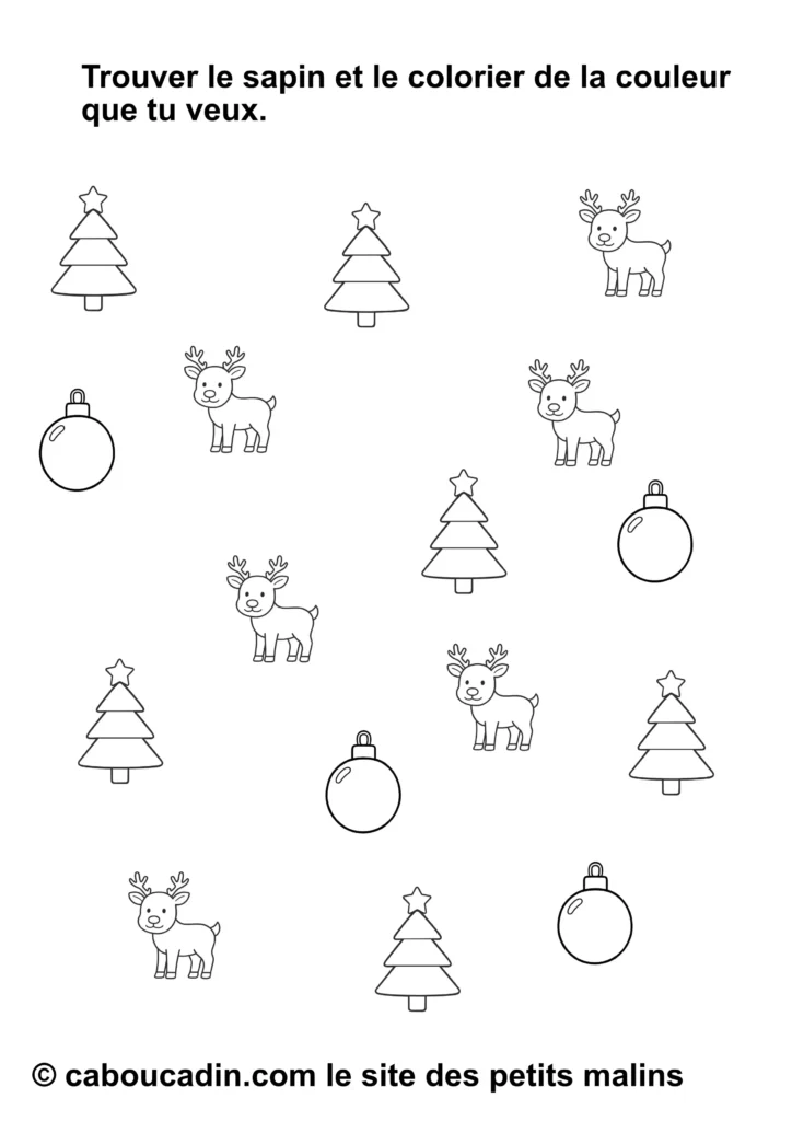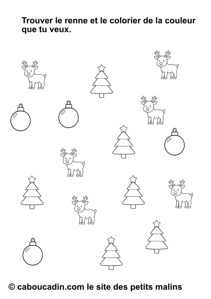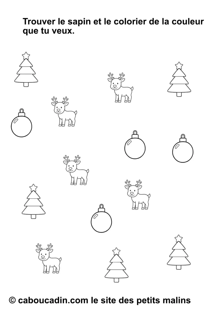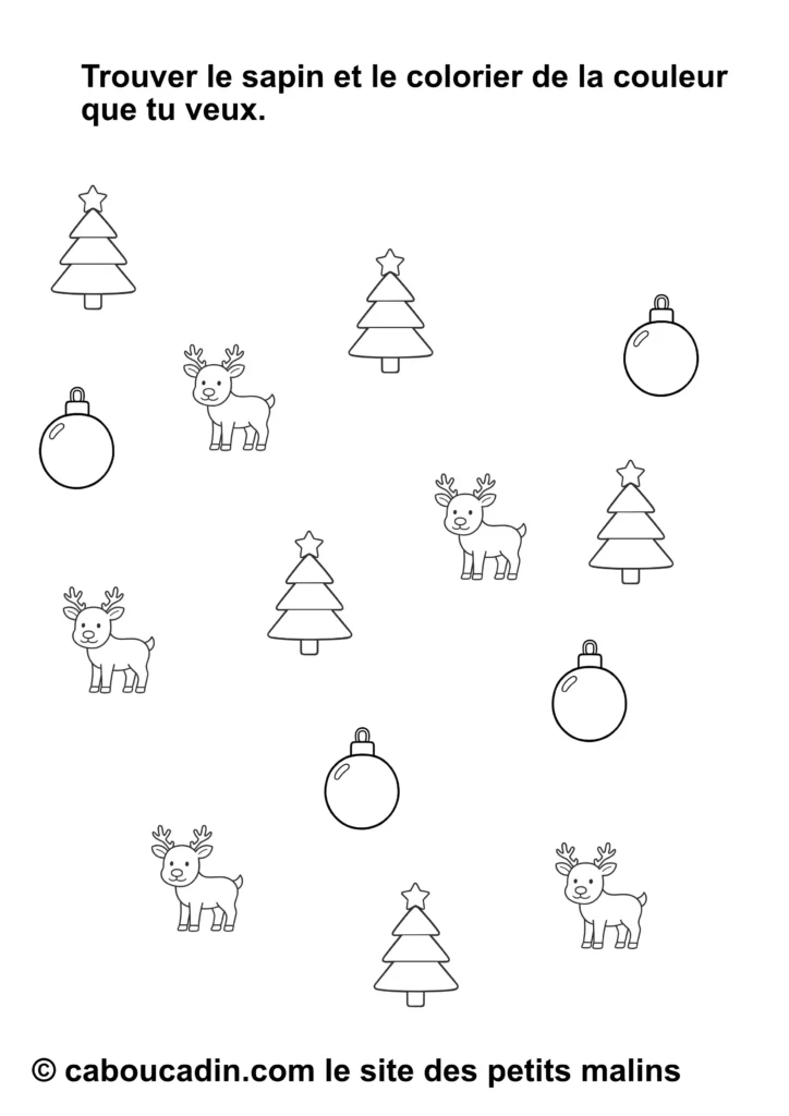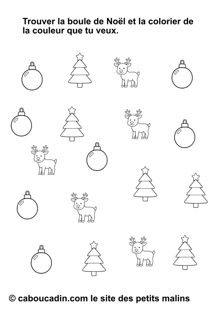Fiche Maternelle de Noël : Trouver et Colorier les Boules, Sapins et Rennes. Aujourd’hui, j’ai envie de t’emmener dans une petite aventure toute douce… une aventure qui sent la neige fraîche, les guirlandes accrochées de travers, le chocolat chaud et même un peu le rire des lutins du Père Noël. Oui oui, ceux qui font « hihi » en se cachant derrière les cadeaux !