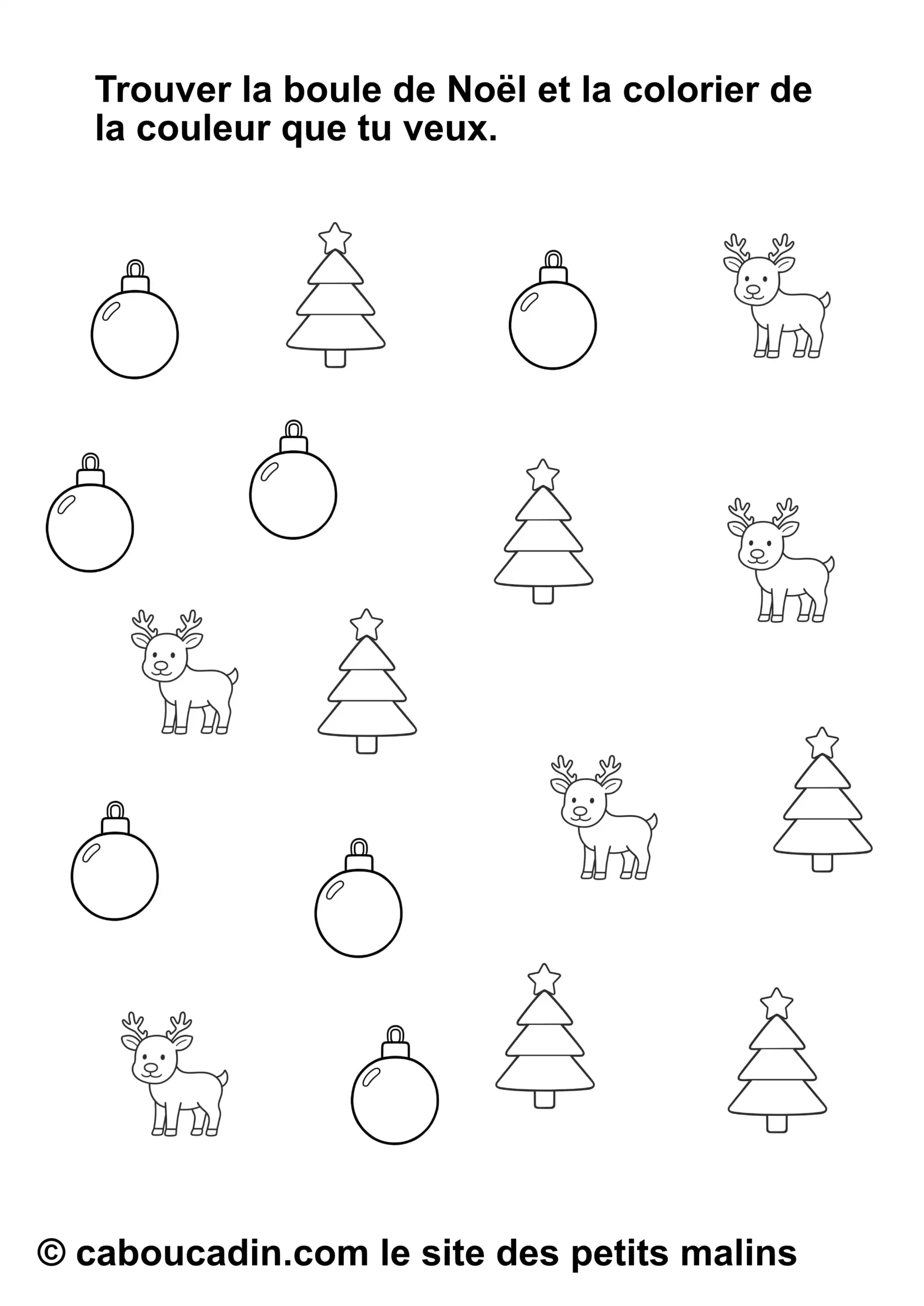 Et puis, surtout… il y a des boules de Noël. Pas encore colorées. Pas encore brillantes. Des boules qui n’attendent qu’une seule chose : être trouvées, puis coloriées par toi.
