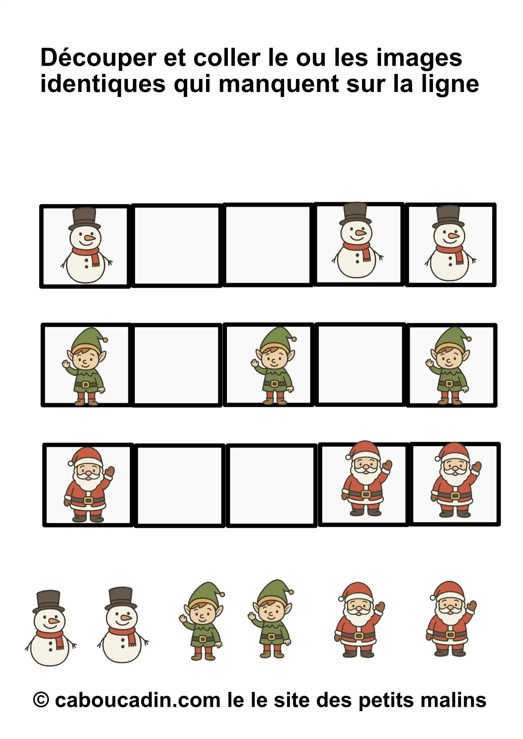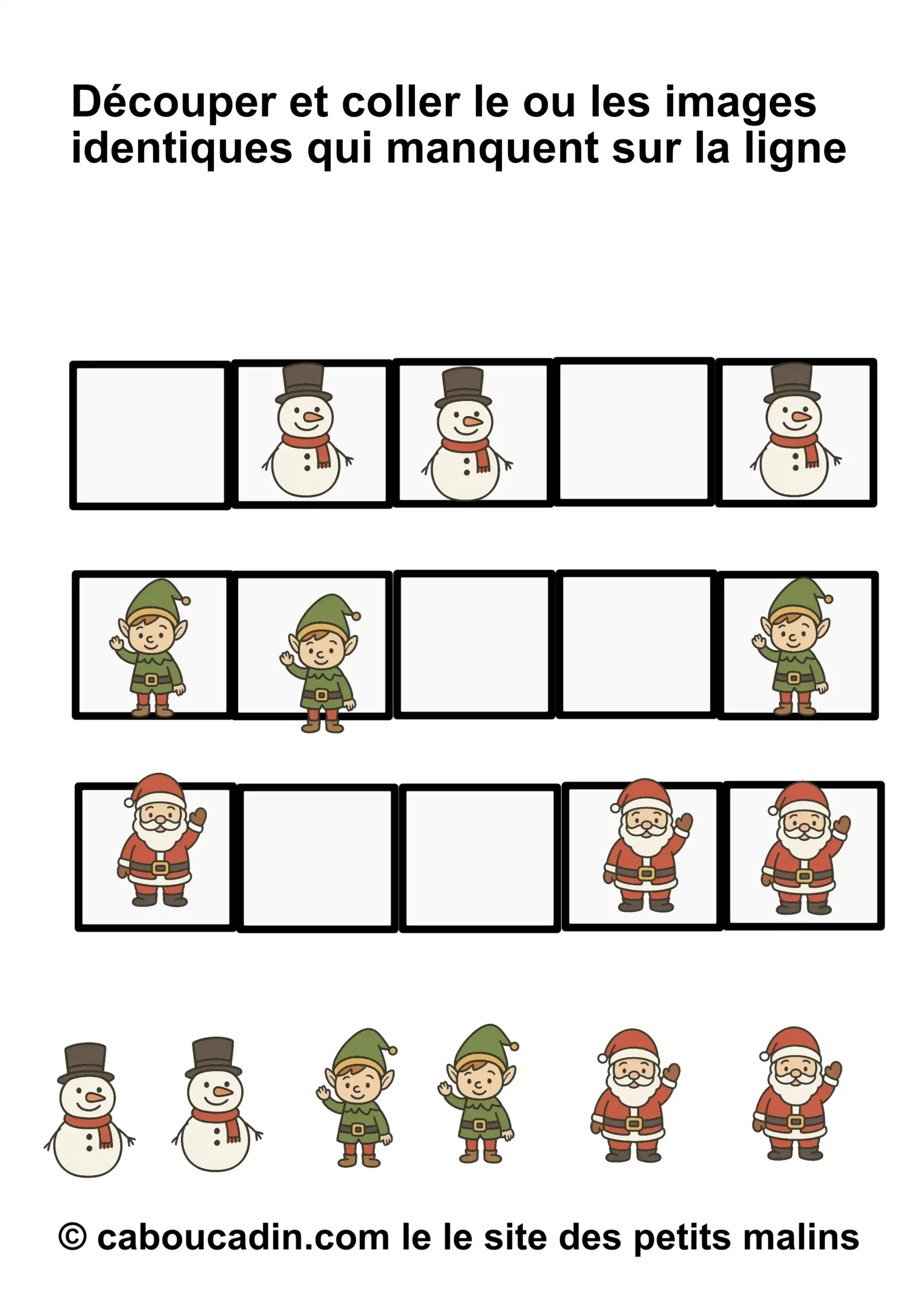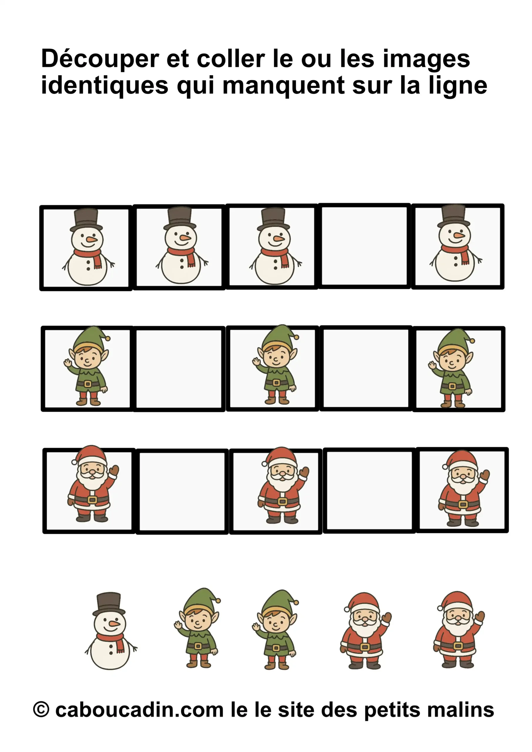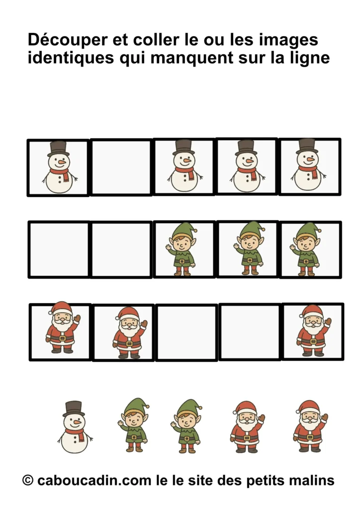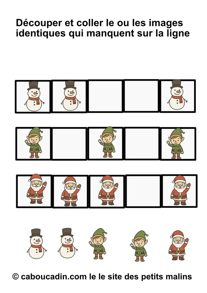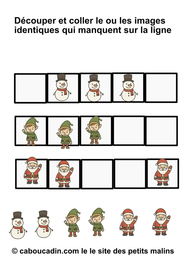 👉 Tu dois découper puis coller l’image identique qui manque sur chaque ligne.