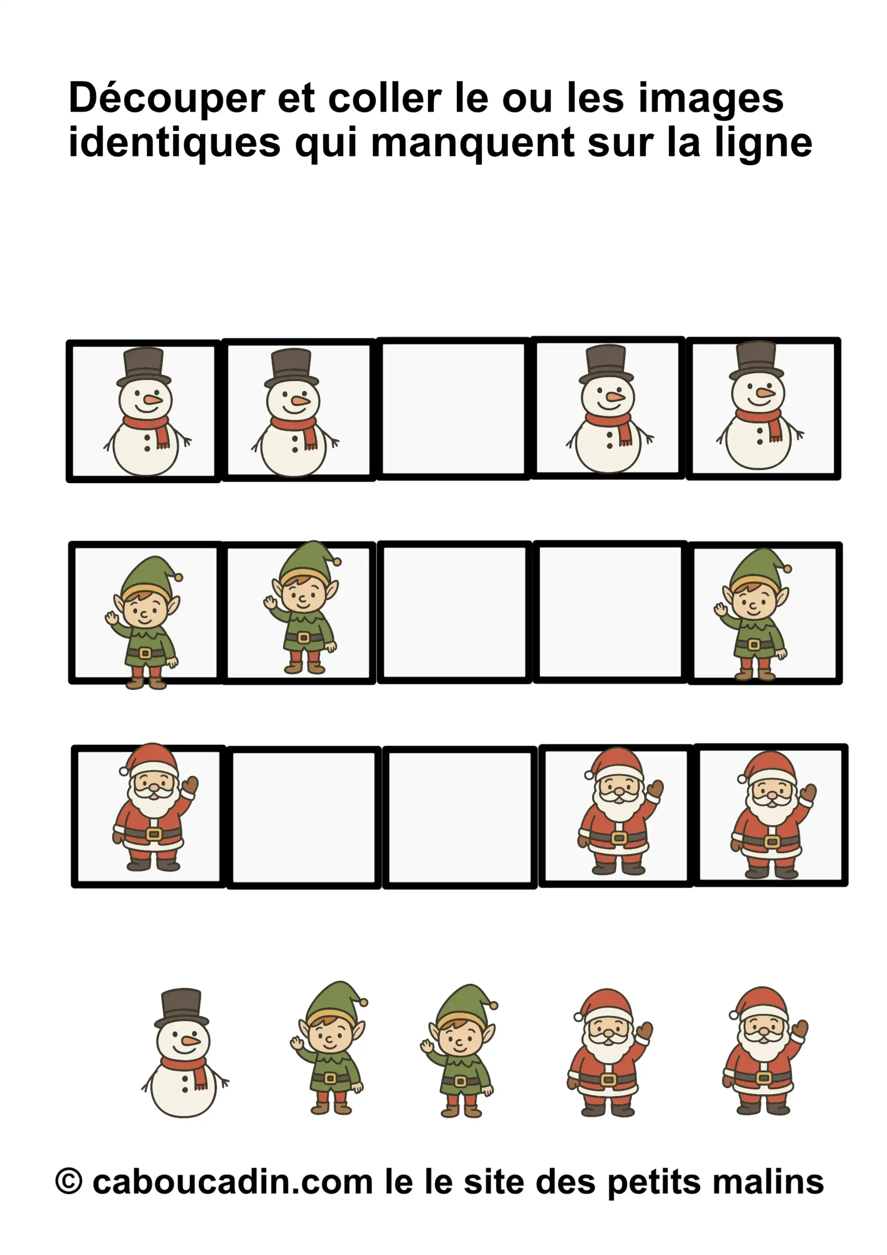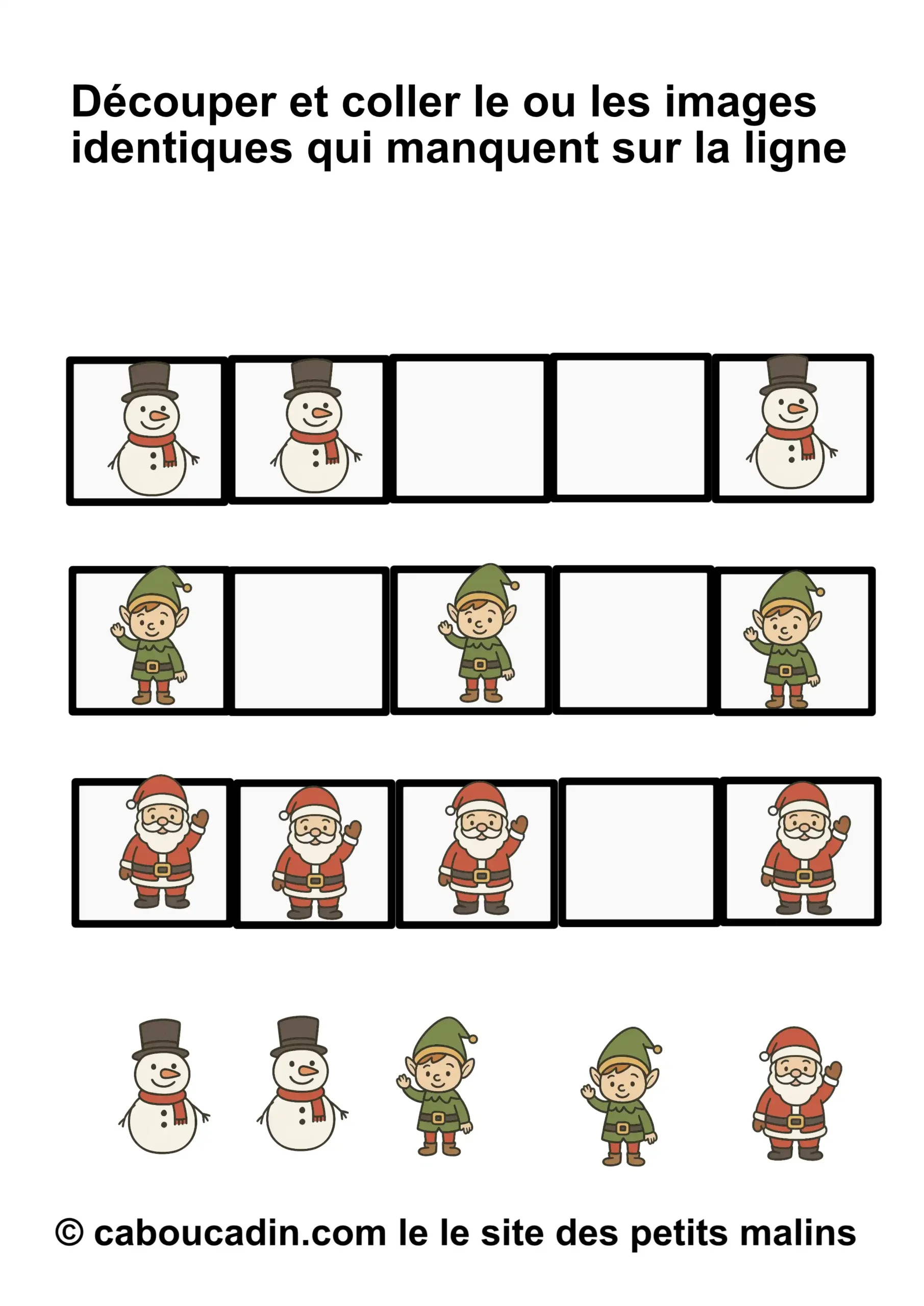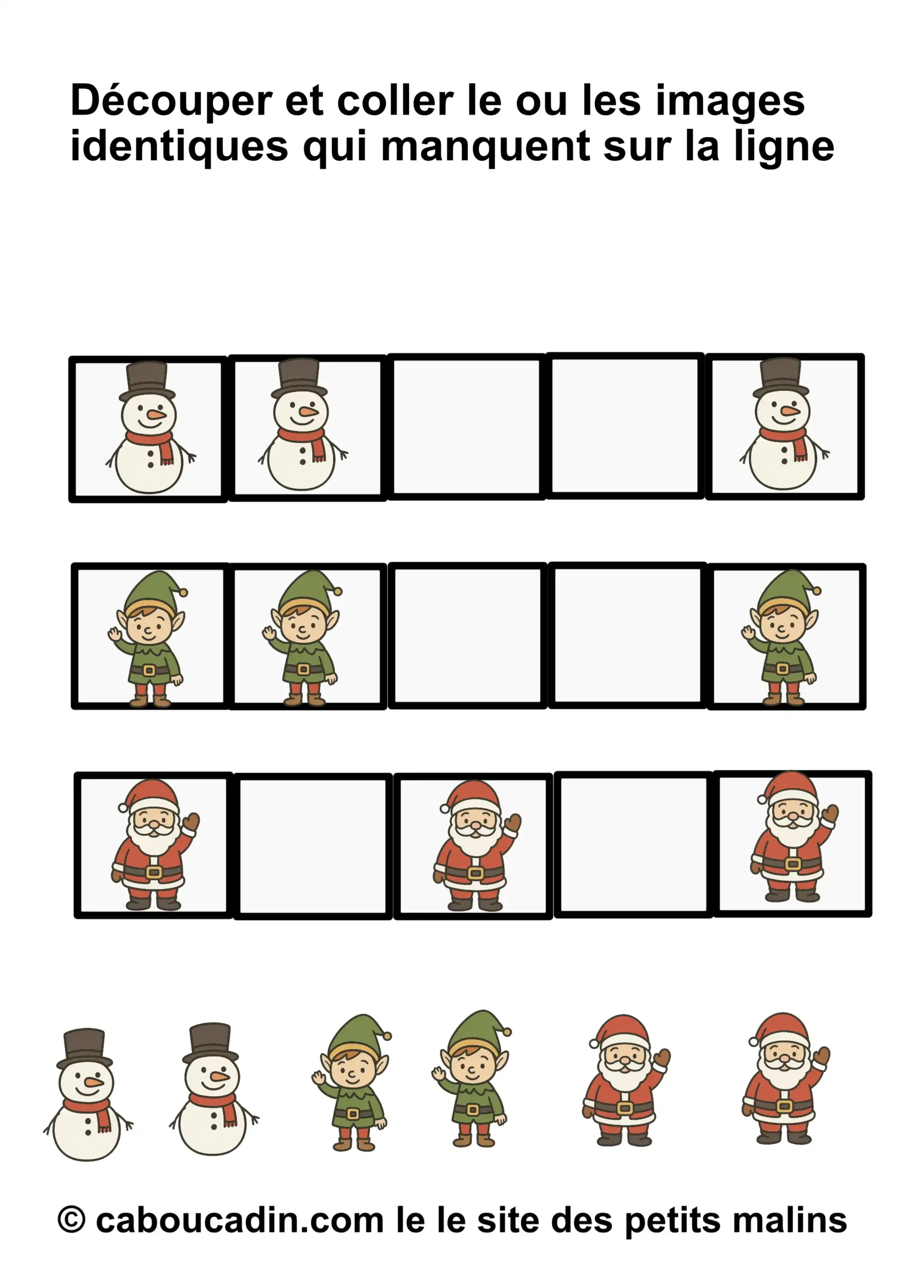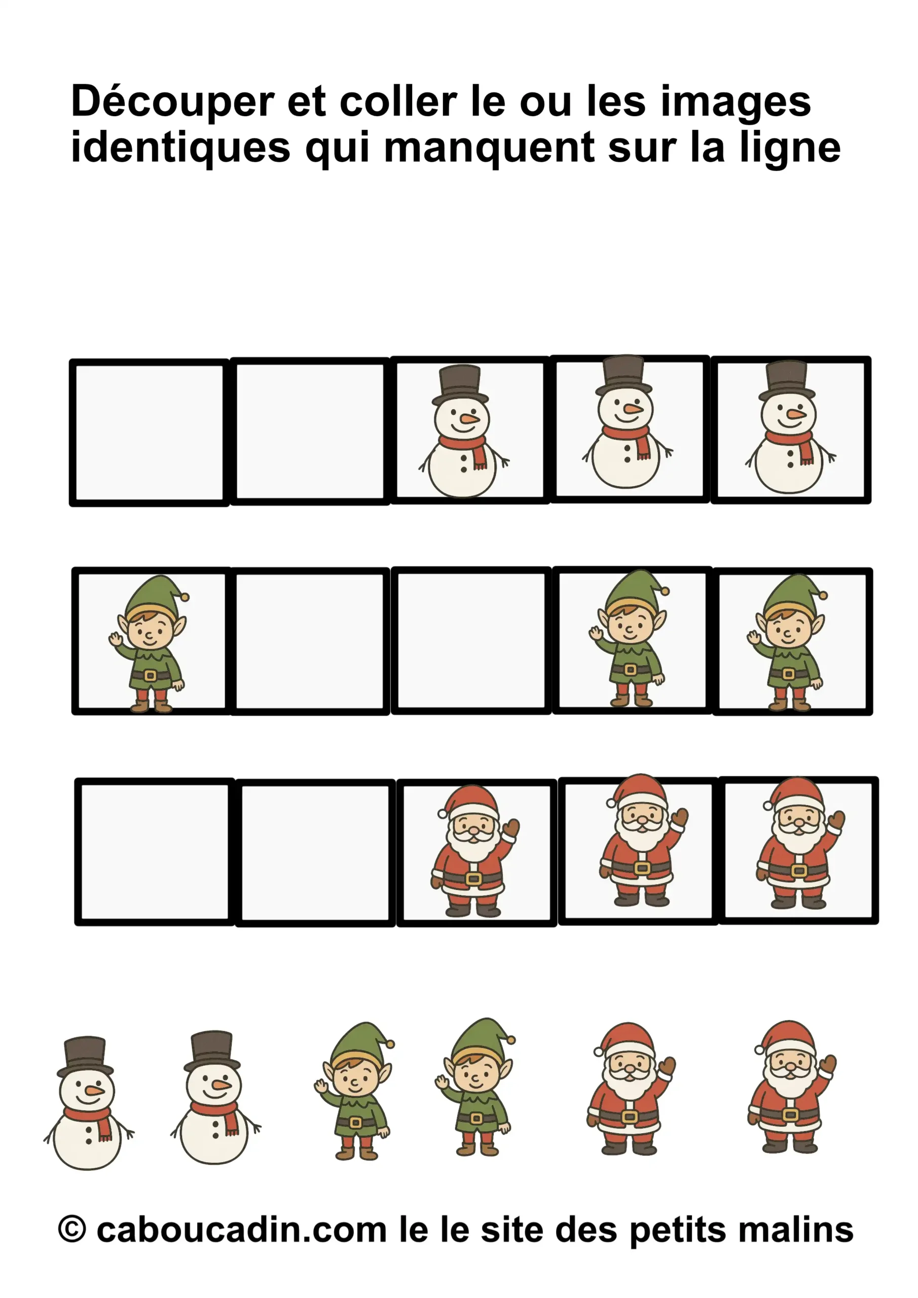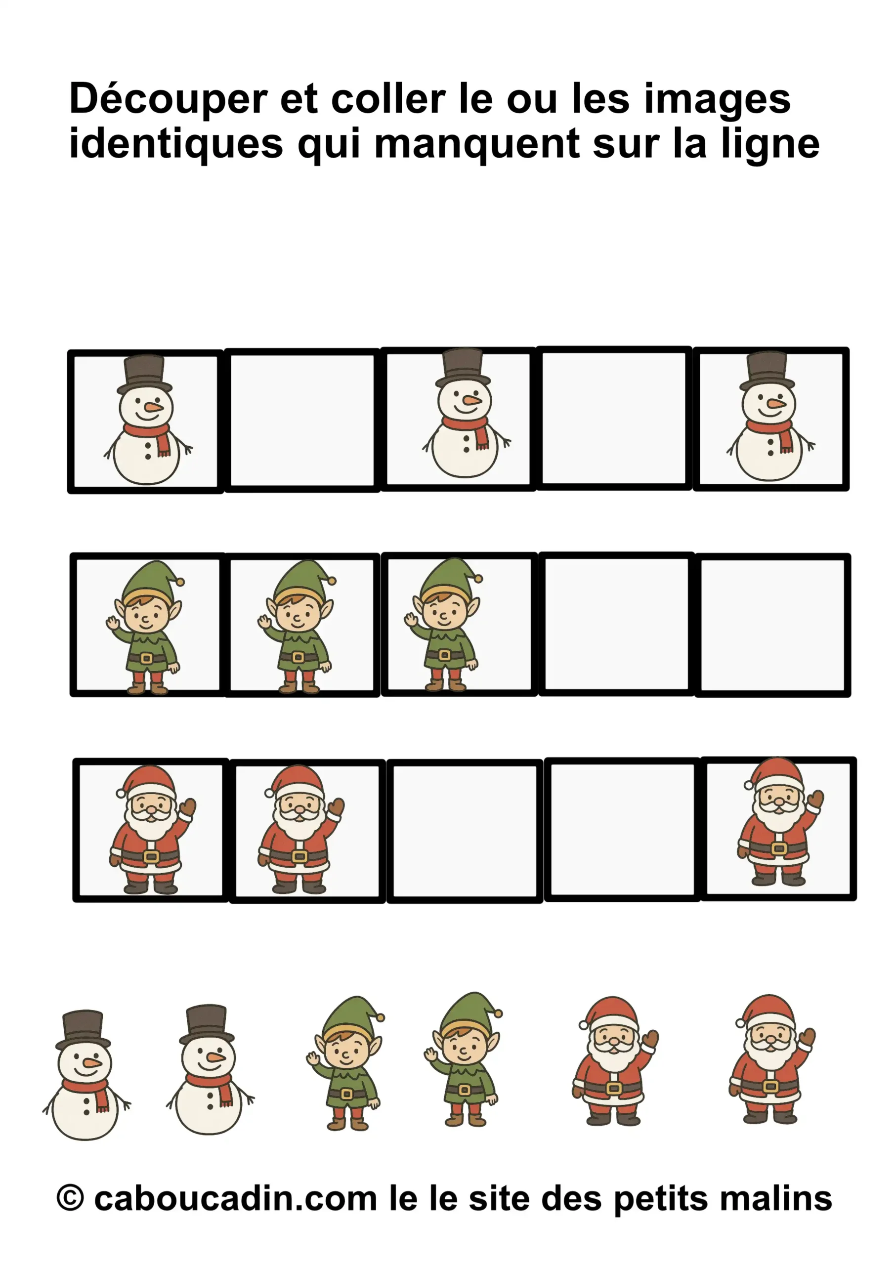 👉 Tu dois découper puis coller l’image identique qui manque sur chaque ligne.