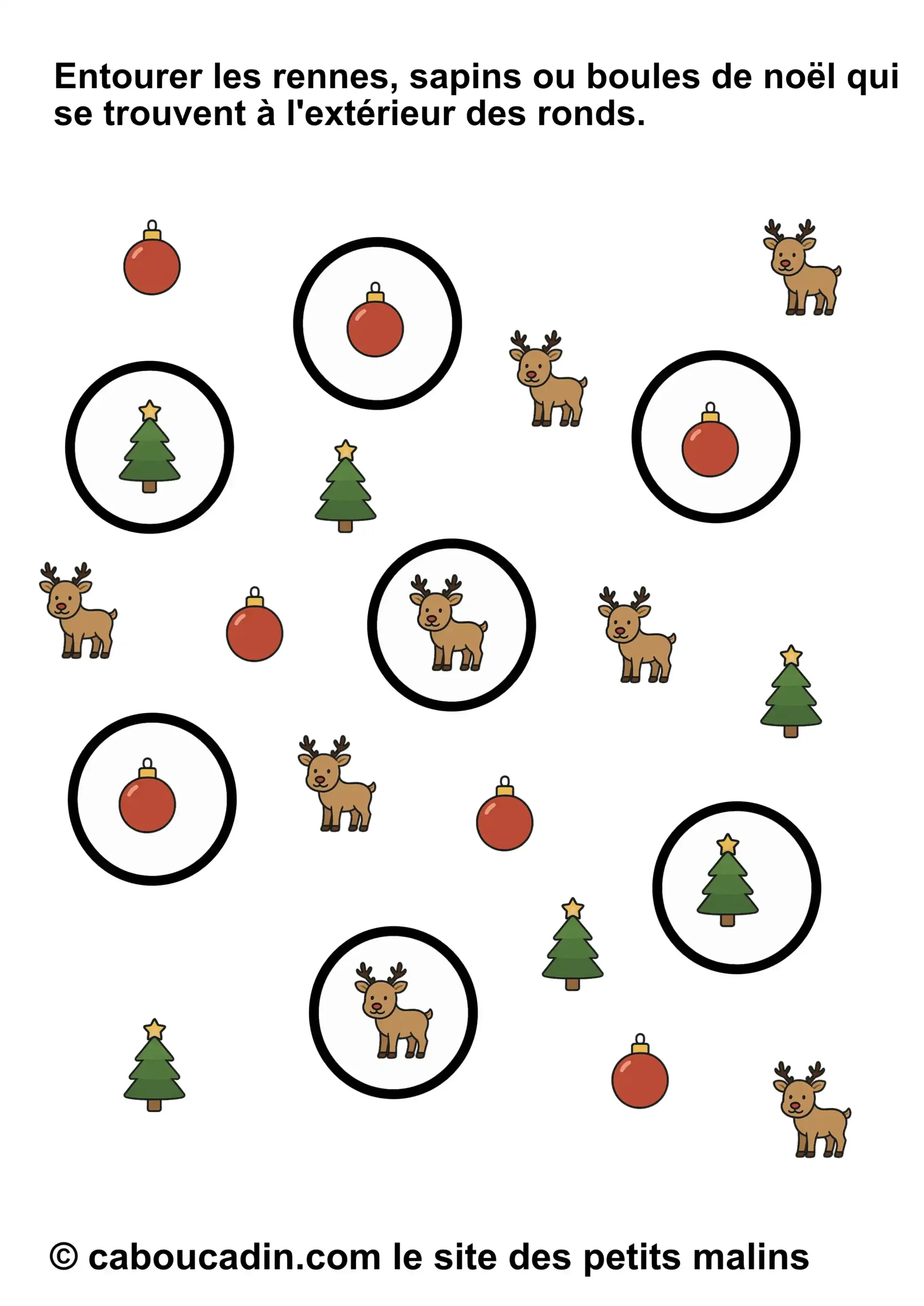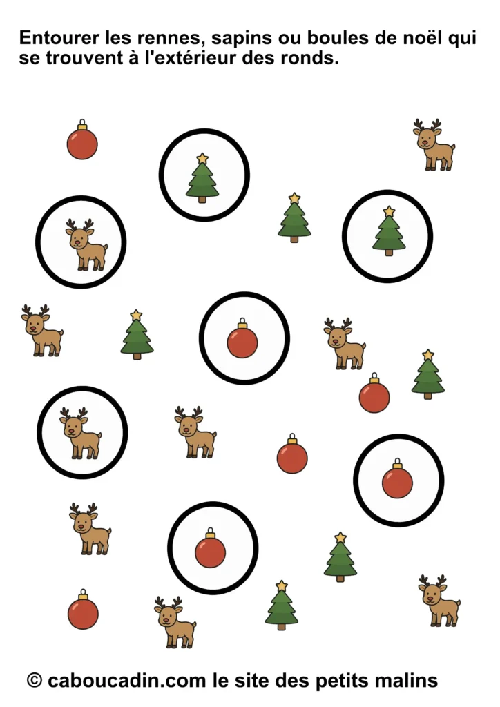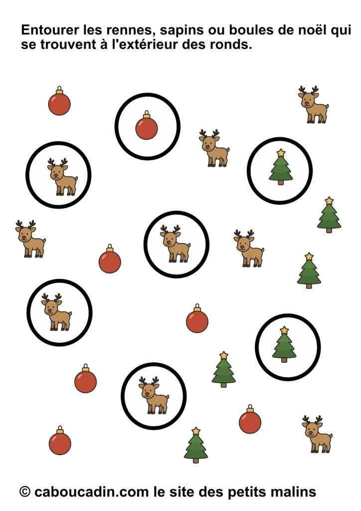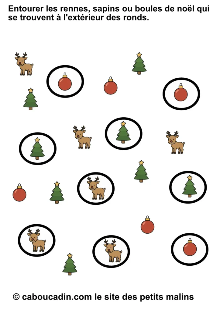 👉 Fiche Maternelle Noël : Entourer les Images à l’Extérieur des Ronds (Rennes, Sapins, Boules) – Activité à Imprimer: Tu dois entourer seulement les rennes, les sapins et les boules de Noël qui sont à l’extérieur des ronds. Oui, oui, uniquement ceux qui se promènent dehors, comme s’ils faisaient un petit tour avant de rentrer se cacher. Pas question de toucher à ceux qui sont tranquillement installés dans les ronds. Eux, on les laisse en paix. Ils se reposent, un peu comme s’ils dormaient sous une petite bulle magique.