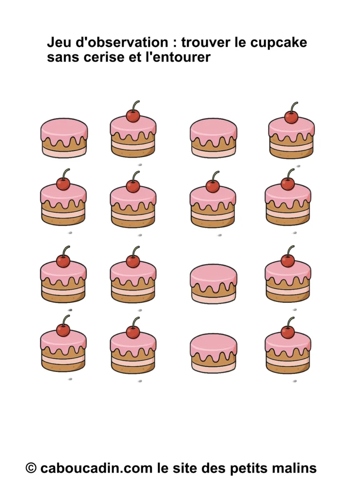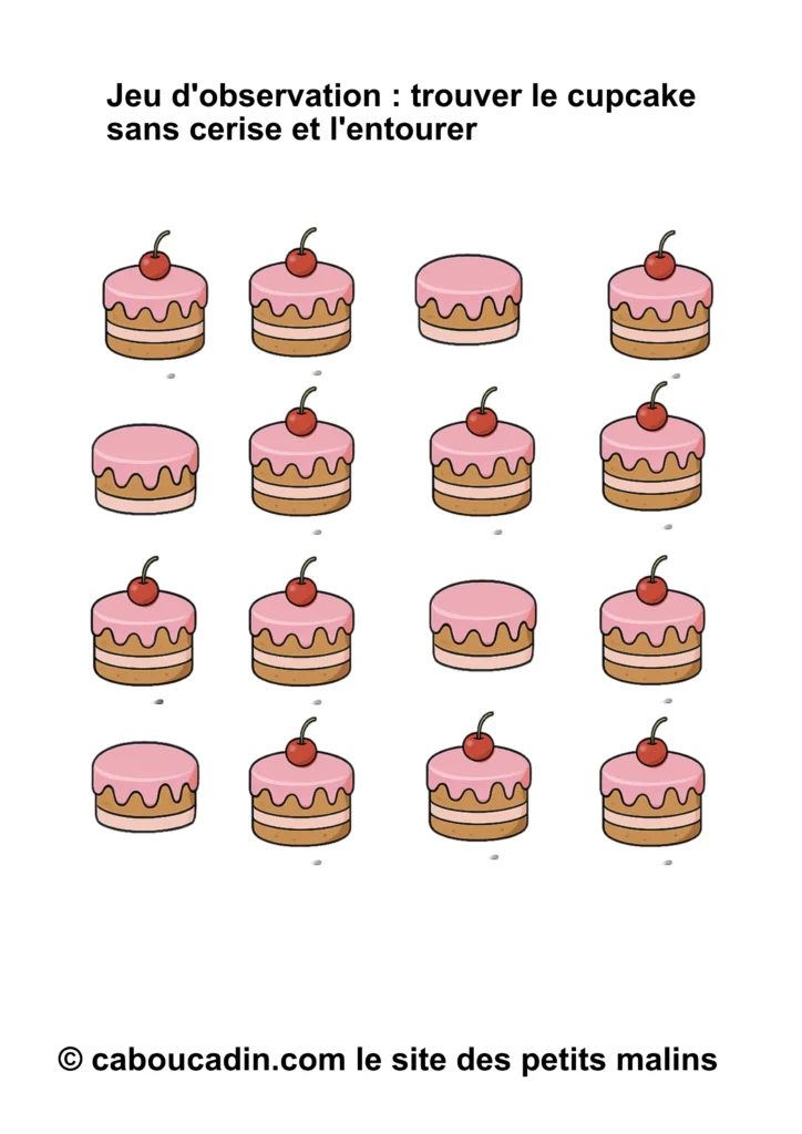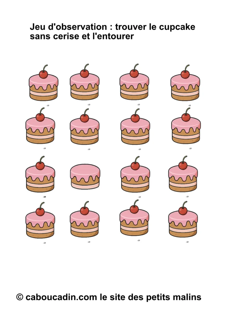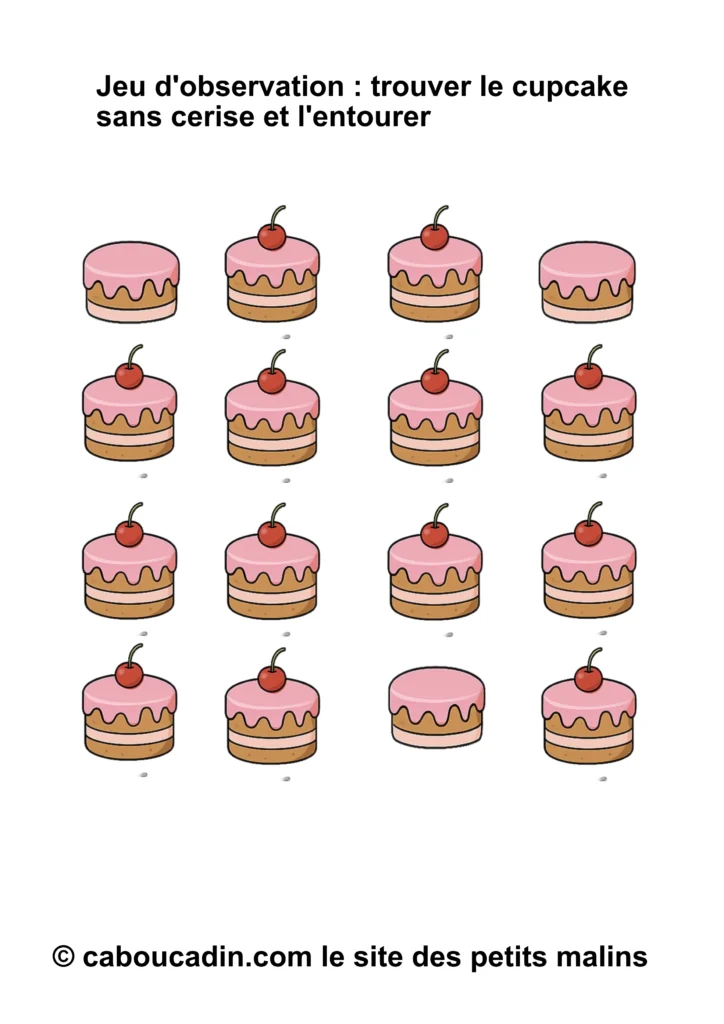 Fiches et Jeux d’observation pour enfants : retrouve le cupcake sans cerise ! Imagine un grand plateau rempli de petits gâteaux tout ronds et tout mignons… 🌸