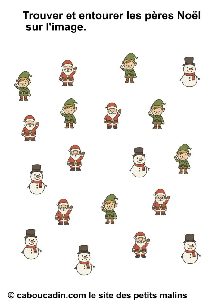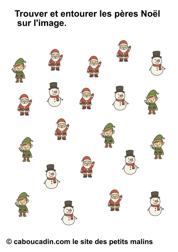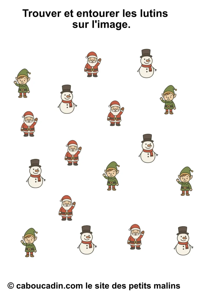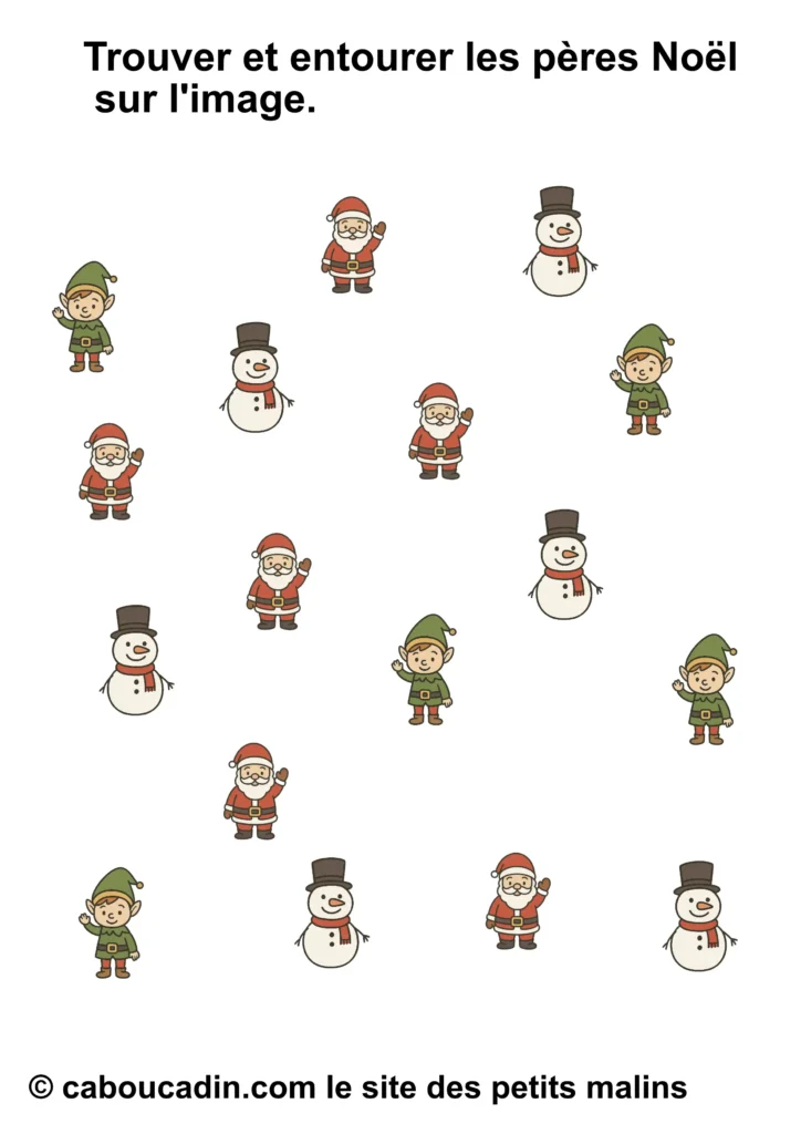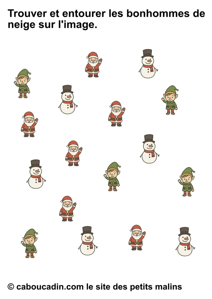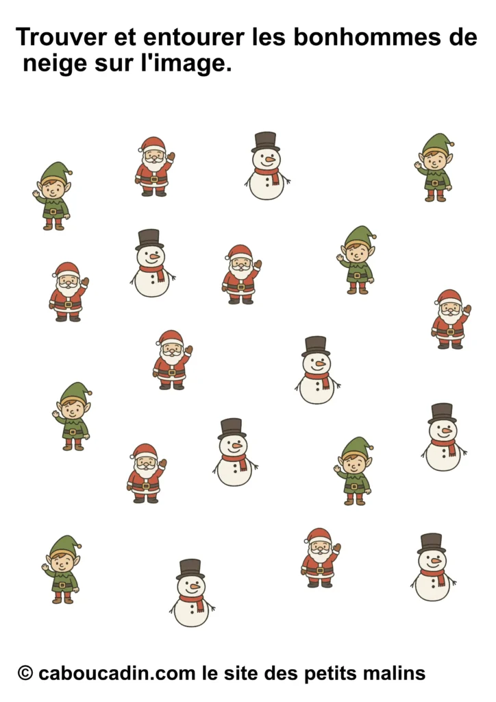 Mais attention, ce joyeux bazar n’est pas là juste pour faire joli. Derrière tout ça, il y a une vraie mission. Une mission secrète, un peu comme celles que les lutins du Père Noël font dans l’atelier, sauf qu’ils sont beaucoup plus maladroits que toi. La consigne, tu vas voir, elle paraît simple, mais elle demande un œil bien réveillé : tu dois entourer seulement le bon personnage. Pas tous, hein. Seulement celui qu’on te demande. Parfois ce sera le bonhomme de neige. Parfois ce sera le lutin. Parfois ce sera le Père Noël. Et parfois tu auras envie d’entourer tout le monde, juste parce qu’ils sont mignons, mais… non. Il faut choisir, pas tricher. (Bon, si tu triches un tout petit peu, personne ne dira rien, mais chut.)