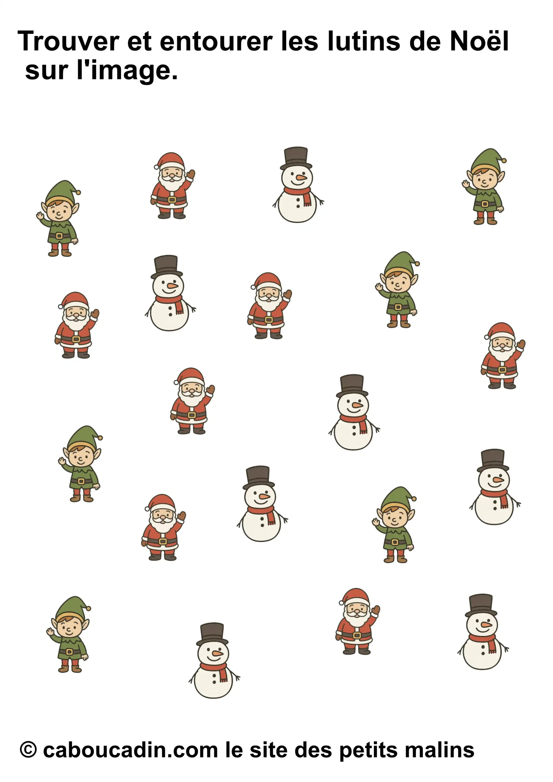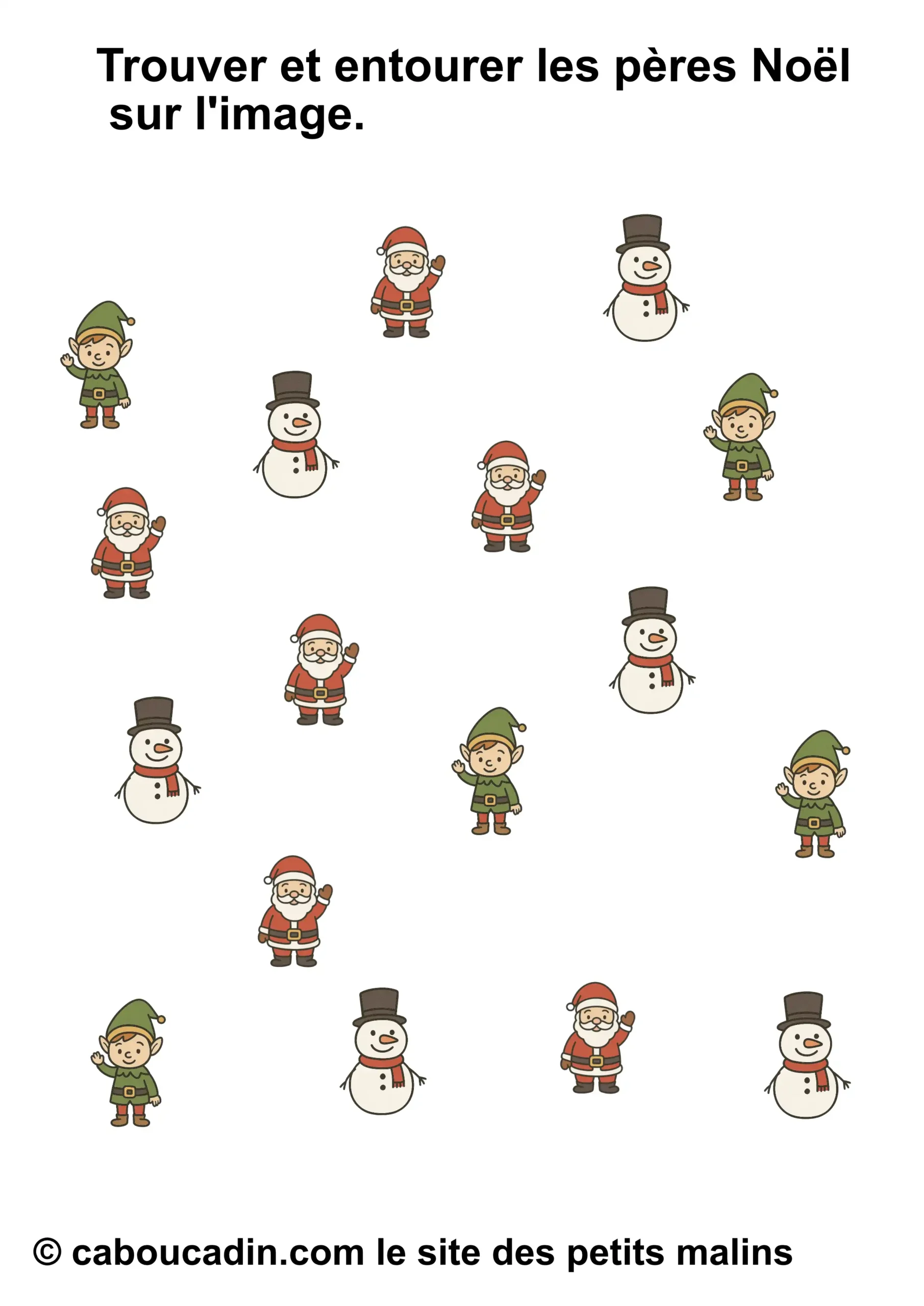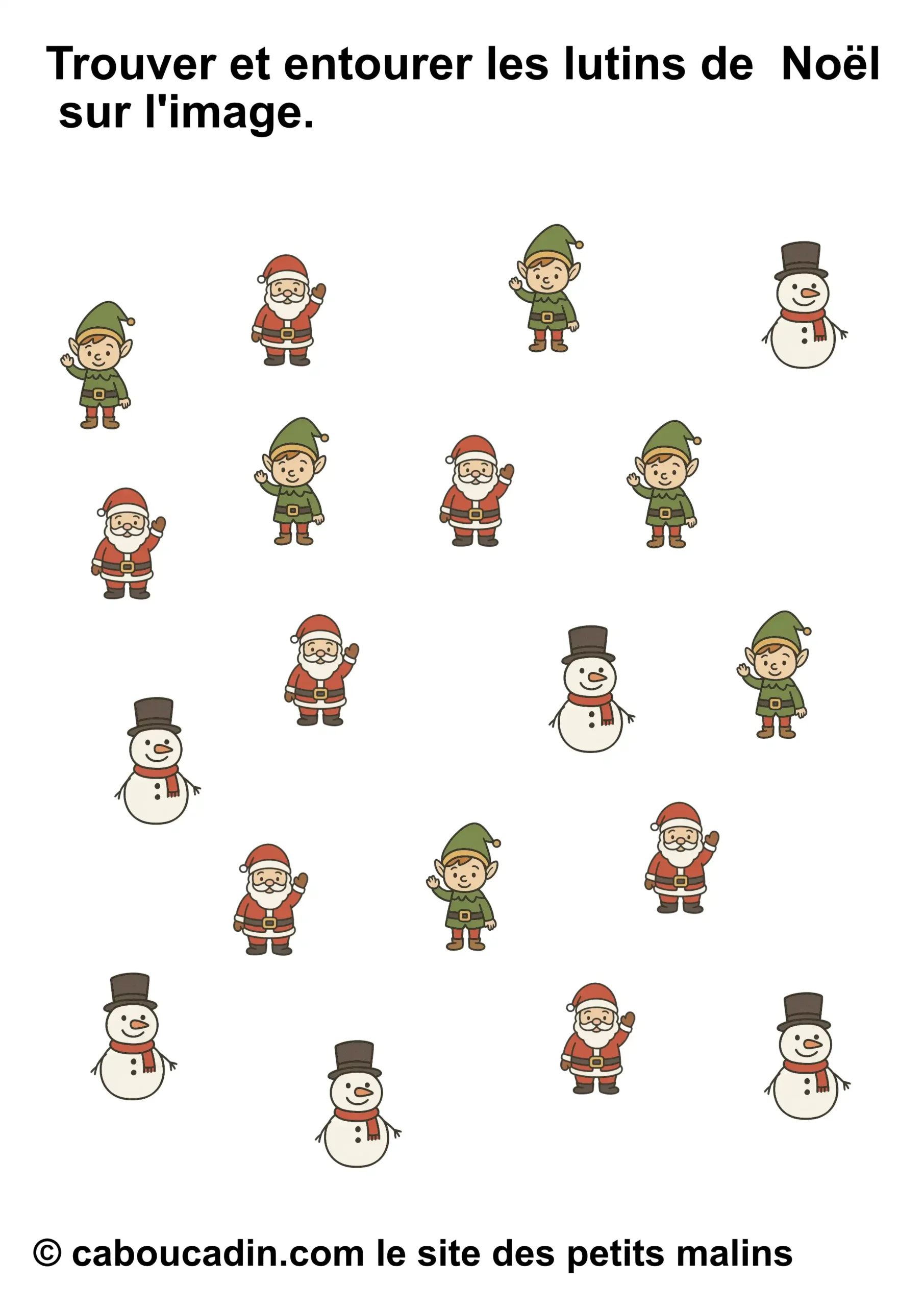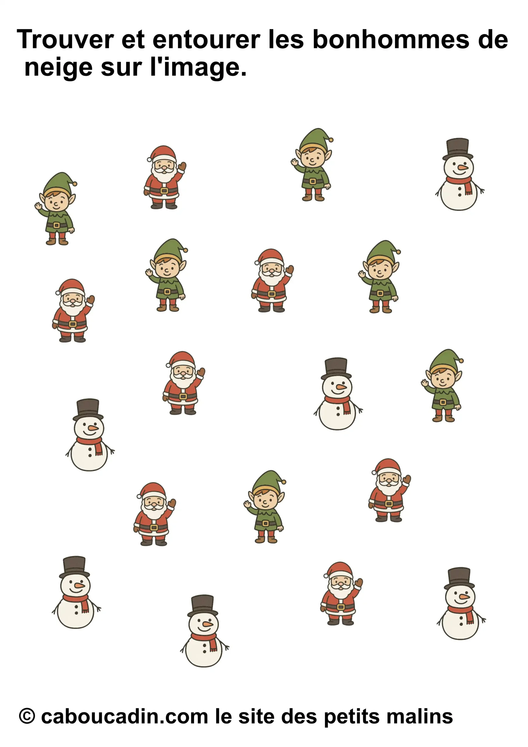Mais attention, ce joyeux bazar n’est pas là juste pour faire joli. Derrière tout ça, il y a une vraie mission. Une mission secrète, un peu comme celles que les lutins du Père Noël font dans l’atelier, sauf qu’ils sont beaucoup plus maladroits que toi. La consigne, tu vas voir, elle paraît simple, mais elle demande un œil bien réveillé : tu dois entourer seulement le bon personnage. Pas tous, hein. Seulement celui qu’on te demande. Parfois ce sera le bonhomme de neige. Parfois ce sera le lutin. Parfois ce sera le Père Noël. Et parfois tu auras envie d’entourer tout le monde, juste parce qu’ils sont mignons, mais… non. Il faut choisir, pas tricher. (Bon, si tu triches un tout petit peu, personne ne dira rien, mais chut.)